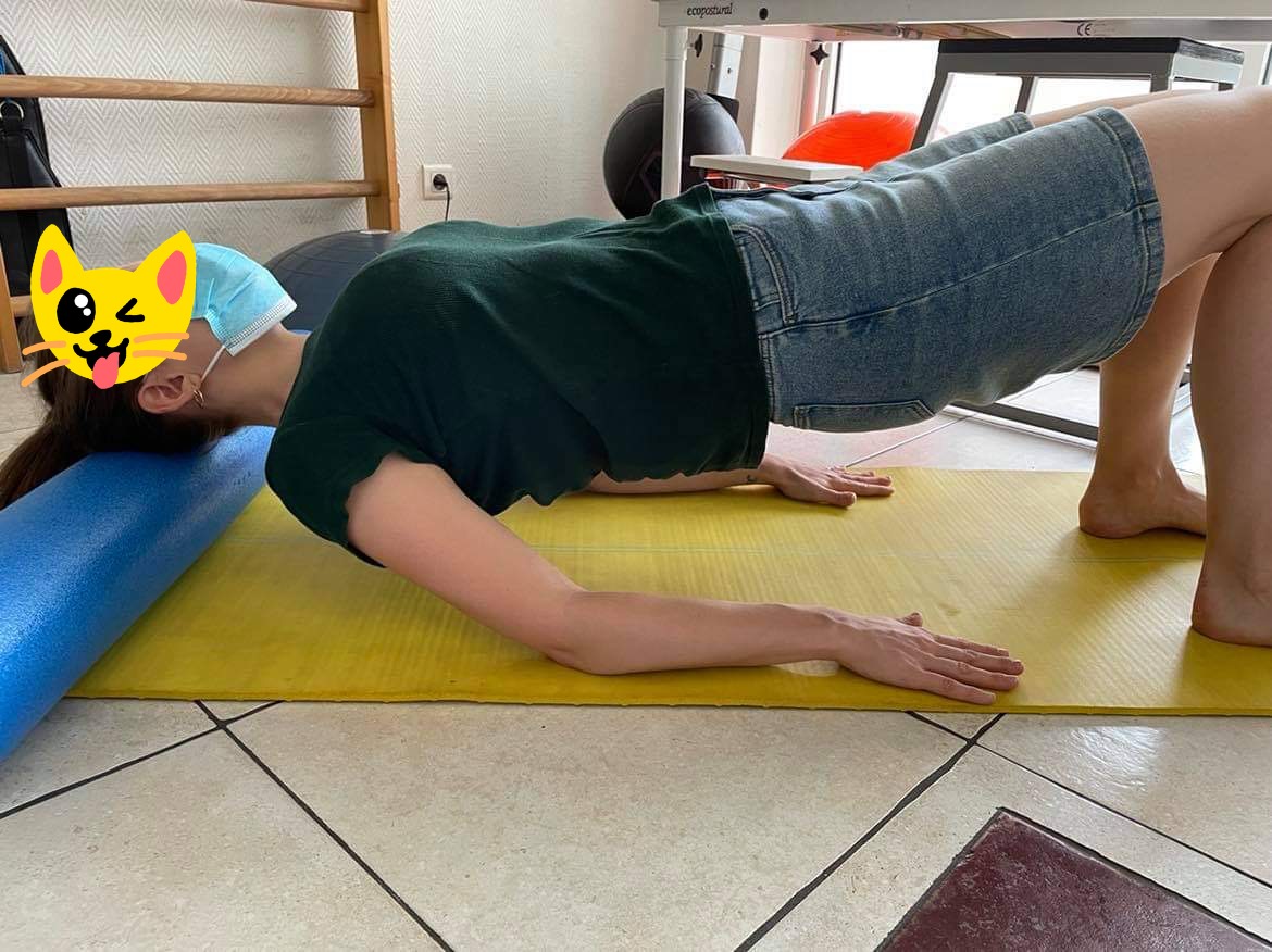 Début de la Prise en charge pour cette patiente enceinte de 8 SA souffrant de lombalgie aiguë: massages à base de crème neutre et auto-étirement.