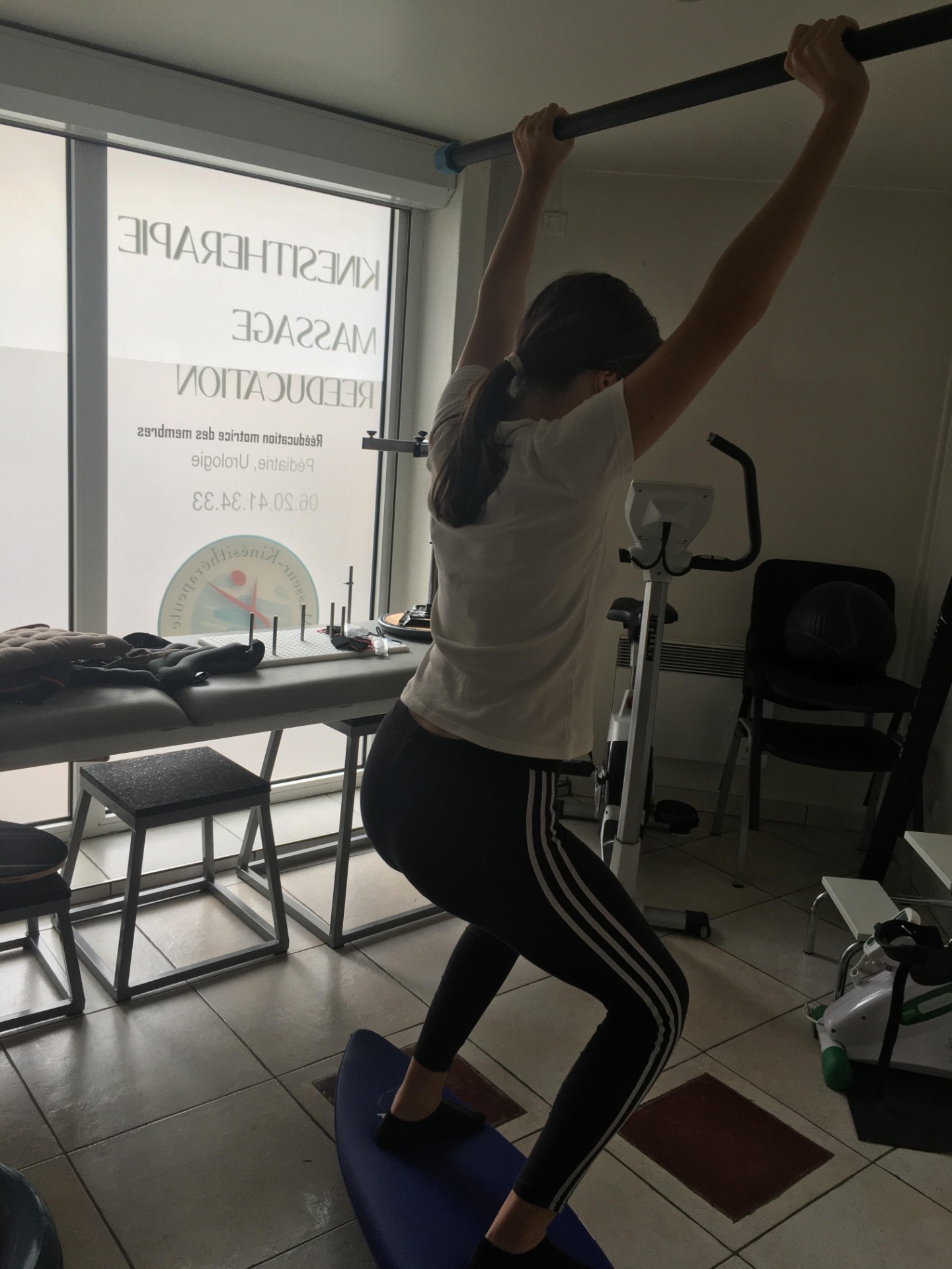 Dernière phase rééducative: Travail en chaine cinétique fermée et chaise cinétique ouverte sur FLOWING® et BOSU® . Une dizaine de séances furent nécessaires.