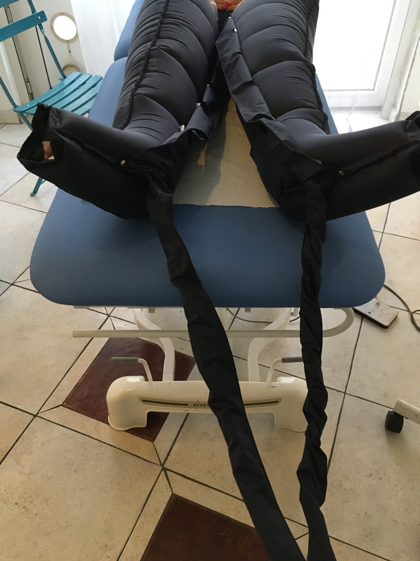 Séance de pressothérapie des deux membres inférieurs après une sortie vélo de 120 km avec 3300 D+. Avec massage à base de crème au menthol.